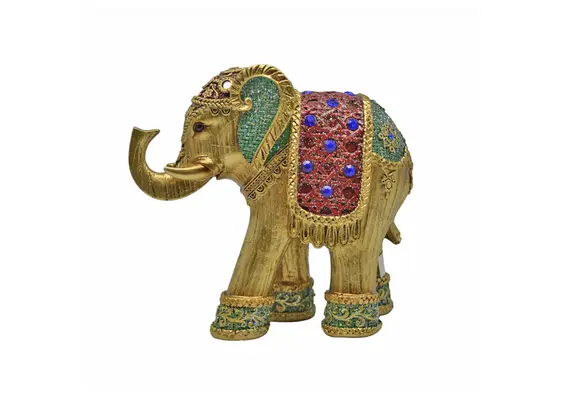 Διακοσμητικός ελέφαντας πολυεστερικός σε χρυσό χρώμα με πετρόλ και κόκκινες λεπτομέρειες, μπλε χάντρες σε έθνικ στυλ. Ξεχωριστά αντικείμενα για να στολίσετε το σπίτι σας ή να τα προσφέρετε σαν δώρο στα αγαπημένα σας πρόσωπα