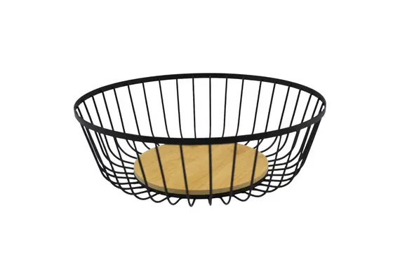 Φρουτιέρα μεταλλική σε μαύρο ματ χρώμα με ξύλινη επιφάνεια.