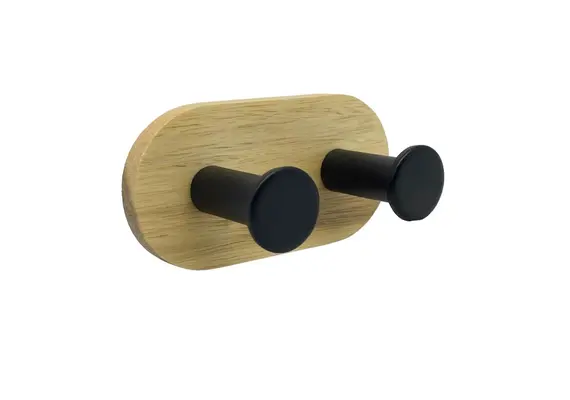 Κρεμάστρα από ξύλο ακακίας με δύο μαύρα ματ μεταλλικά κρεμαστράκια κ δυνατότητα τοποθέτησης μόνο με αυτοκόλλητο διπλής όψης 3Μ το οποίο συμπεριλαμβάνεται στη συσκευασία. Ιδανικές κρεμάστρες αν δε θέλετε να τρυπήσετε τον τοίχο ή την πόρτα σας.