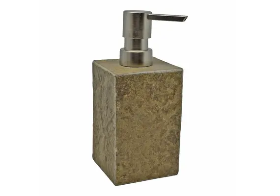 Σαπουνοθήκη για υγρό σαπούνι από μάρμαρο, σε παλαιωμένη όψη, καφέ λαδί χρώμα και αντλία ασημί με ματ φινίρισμα. Αξεσουάρ μπάνιου εξαιρετικής ποιότητας με μοντέρνο και κομψό σχεδιασμό. Συνδυάστε τα ιδανικά με αντικείμενα της υπόλοιπης σειράς.