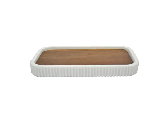 Σαπουνοθήκη-δισκάκι πολυεστερικό σε λευκό χρώμα με διακόσμηση ανάγλυφες γραμμές και ξύλο ακακίας στο εσωτερικό. Αξεσουάρ μπάνιου εξαιρετικής ποιότητας με μοντέρνο και κομψό σχεδιασμό. Συνδυάστε τα ιδανικά με αντικείμενα της υπόλοιπης σειράς.