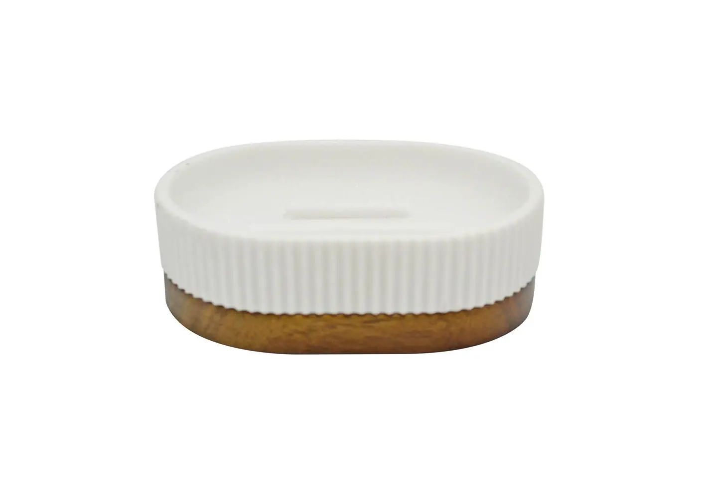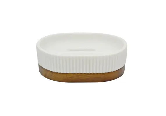 Σαπουνοθήκη πολυεστερική σε λευκό χρώμα με διακόσμηση ανάγλυφες γραμμές και ξύλο ακακίας στο κάτω μέρος. Αξεσουάρ μπάνιου εξαιρετικής ποιότητας με μοντέρνο και κομψό σχεδιασμό. Συνδυάστε τα ιδανικά με αντικείμενα της υπόλοιπης σειράς.