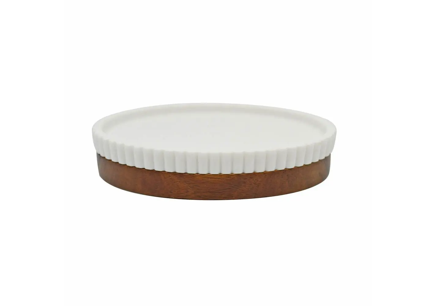 Σαπουνοθήκη πολυεστερική σε λευκό χρώμα με διακόσμηση ανάγλυφες γραμμές και ξύλο ακακίας στο κάτω μέρος. Αξεσουάρ μπάνιου εξαιρετικής ποιότητας με μοντέρνο και κομψό σχεδιασμό. Συνδυάστε τα ιδανικά με αντικείμενα της υπόλοιπης σειράς.
