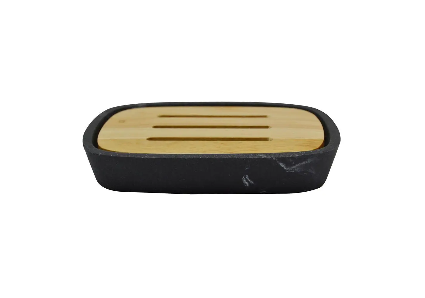 Σαπουνοθήκη πολυεστερική με διακόσμηση εφέ μαύρο μάρμαρο και ξύλο μπαμπού στο πάνω μέρος. Αξεσουάρ μπάνιου εξαιρετικής ποιότητας με μοντέρνο και κομψό σχεδιασμό. Συνδυάστε τα ιδανικά με αντικείμενα της υπόλοιπης σειράς.