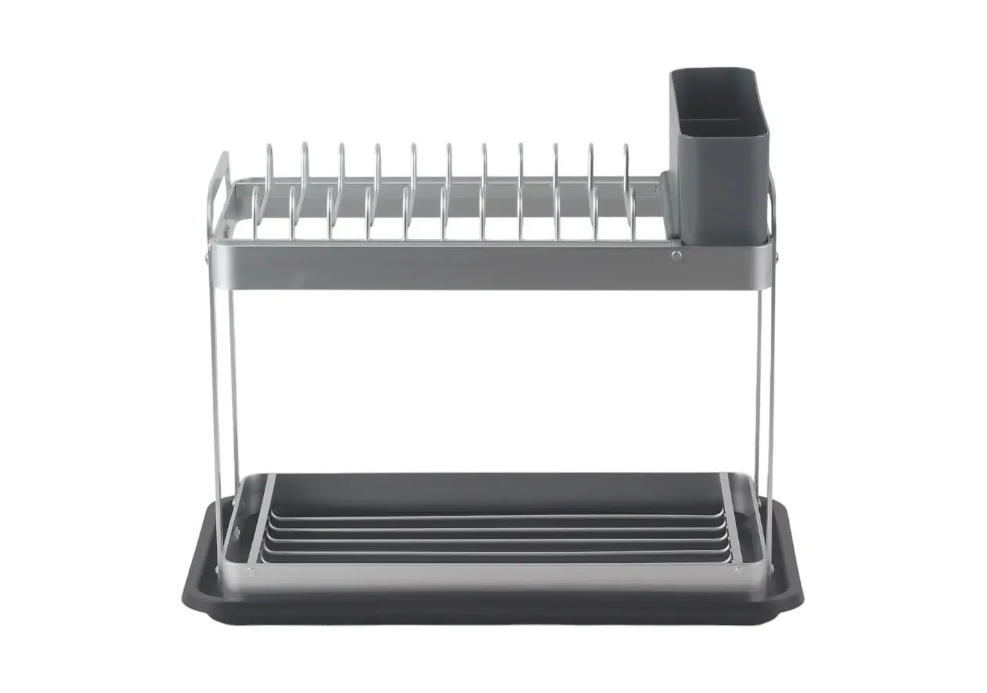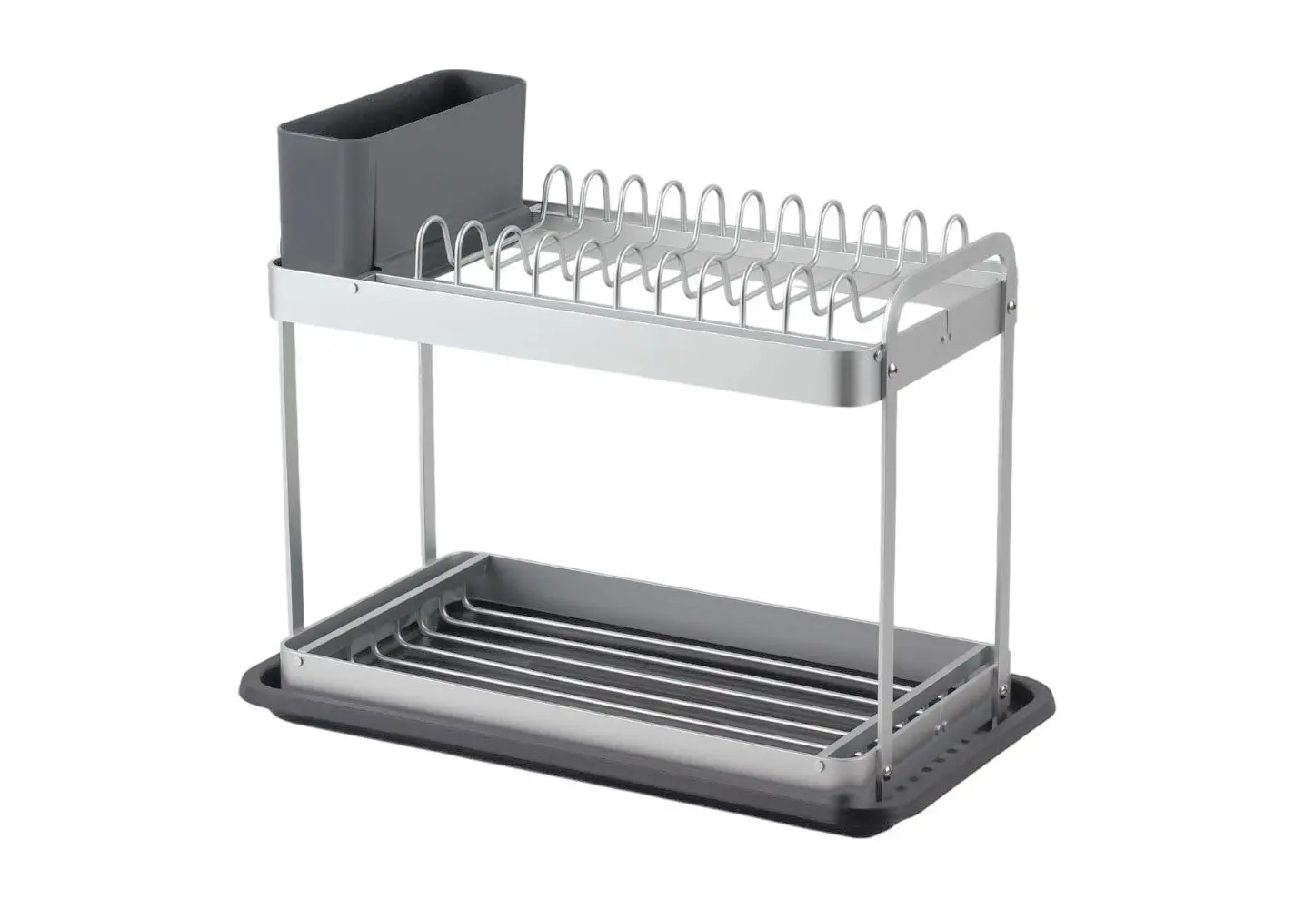 Διώροφη πιατοθήκη από αλουμίνιο υψηλής αντοχής, σε ασημί χρώμα, με γκρι πλαστικό δίσκο και κουταλοθήκη.