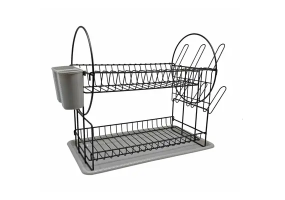 Πιατοθήκη διώροφη μεταλλική μαύρη, η οποία διαθέτει πλαστικό δίσκο και κουταλοθήκη σε γκρι χρώμα.